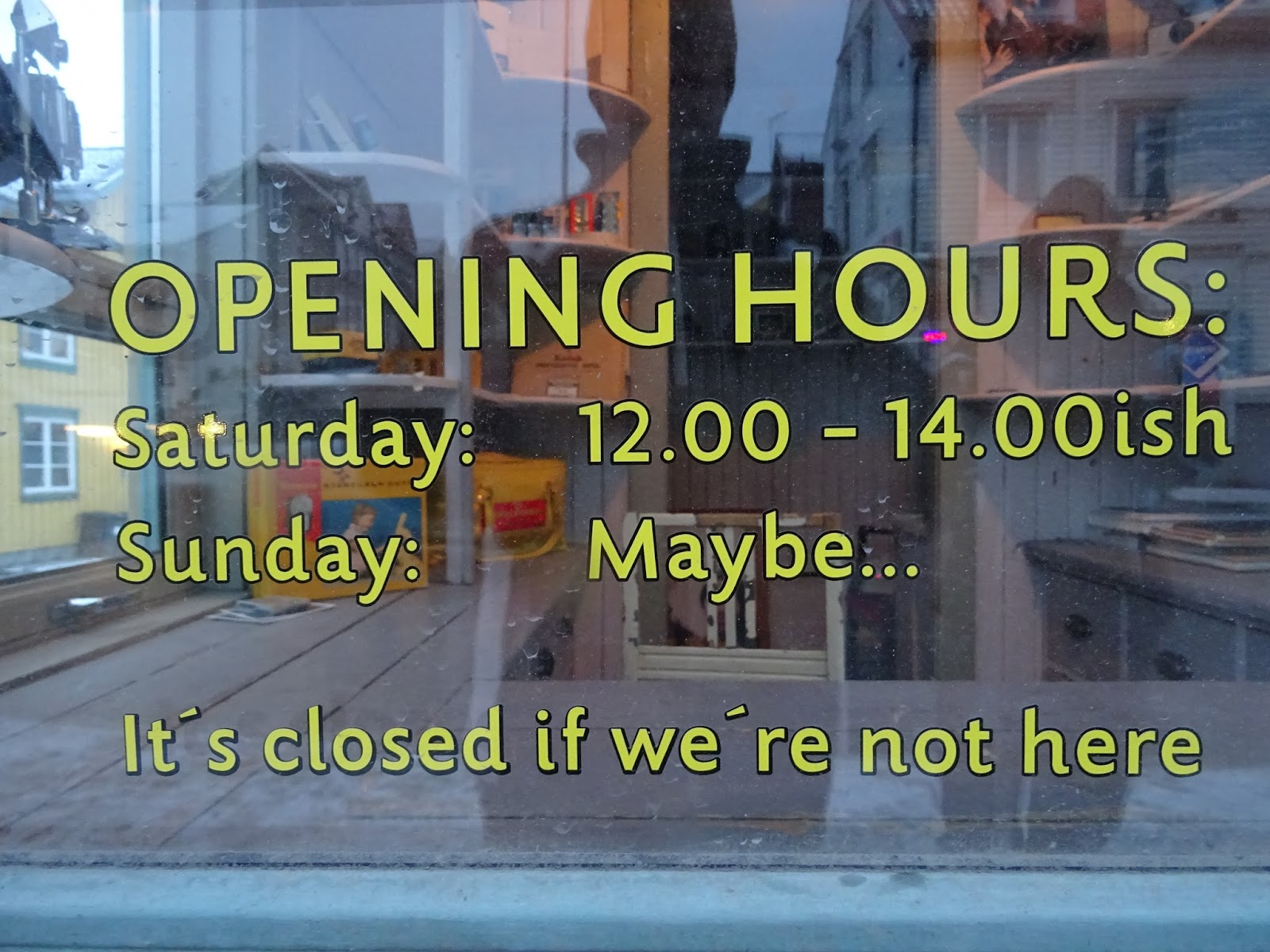 In attesa di risposte vi mostro la vetrina di un negozio, dove l’orario di lavoro è “mooolto” flessibile, e che ho trovato in un posto insospettabile: l’efficientissima Norvegia!